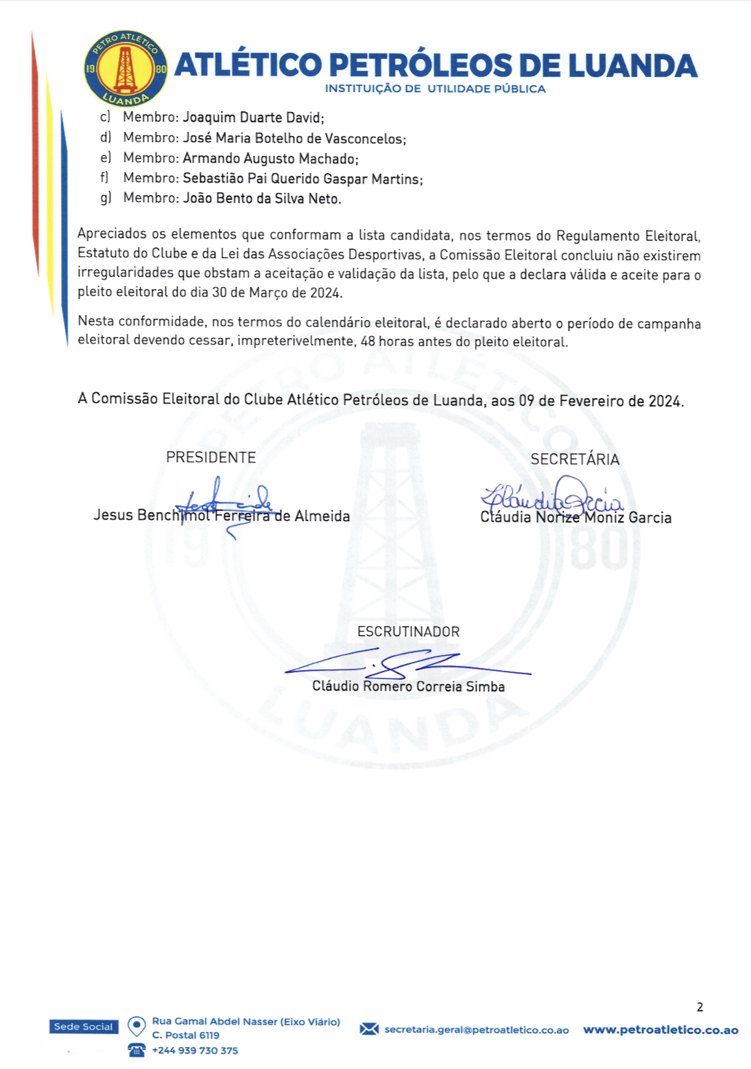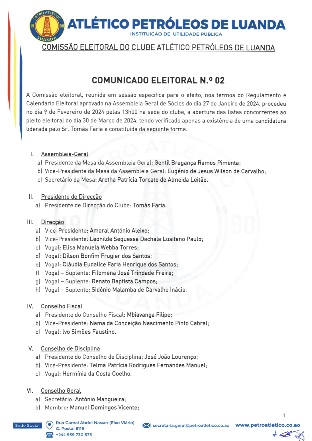 A Comissão eleitoral do Atlético Petróleos de Luanda recebeu e aprovou, ao princípio da tarde de hoje, 09 de Fevereiro, na sede do clube, a lista encabeçada pelo Dr. Tomás Faria, sendo a única concorrente aos órgãos sociais da agremiação, para o quadriénio 2024/2028, cujo pleito eleitoral se realiza a 30 de Março do ano corrente.
